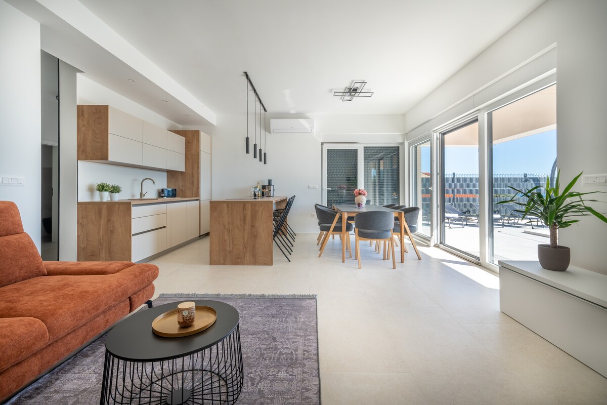 Departamento espacioso y moderno con 4 dormitorios, 3 baños y 2 terrazas. Disfruta de la gran terraza privada en la azotea con jacuzzi y tumbonas para 7 huéspedes, que ofrece unas vistas inmejorables del mar y de los lugares históricos de Zadar a lo lejos. Situado en una zona tranquila, perfecta para relajarse mientras estás cerca del centro de la ciudad y las playas.