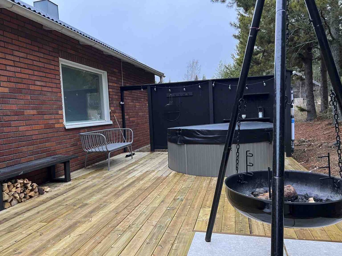Live 5 km from Luleå city center in this modern villa in Hällbacken. Ground floor: -Pleasant outdoor patio -Modern fully equipped kitchen -Bathroom, washer/dryer -Living room -Bedroom King Size bed Upper floor: -Living room with a view over Björkskatafjärden -Bathroom/Sauna -2Bedrooms -Outdoor Hottub area(shared) Public transportation with connections to city, Walking/biking distance to Björksgatan center. Bicycles available to borrow. 5km to the University. 30minute drive to Stegra.