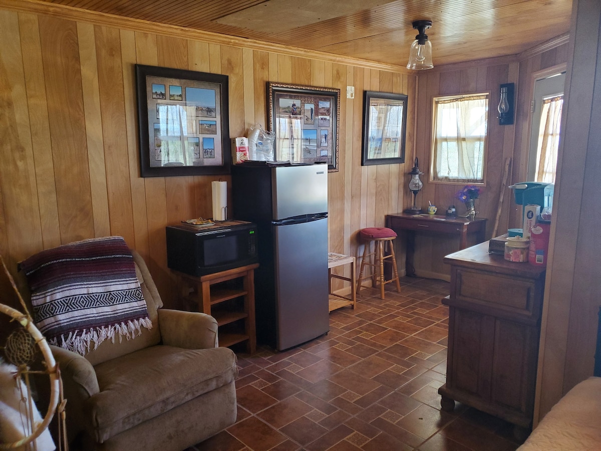 Take it easy at this unique and tranquil getaway. Relax and unwind or visit our local historical sites or spend time with our amazing critters. This cabin is a stunning Dios de la Muertos themed cabin with an amazing spa shower. The custom shower features 5 separate shower heads to choose from. It is adorned with Dios de la Muertos tile and the most gorgeous rocks that were found in the area (rockhounding tours avail) and cut and used as a border in the wall tile. There's a bidet toilet feature.