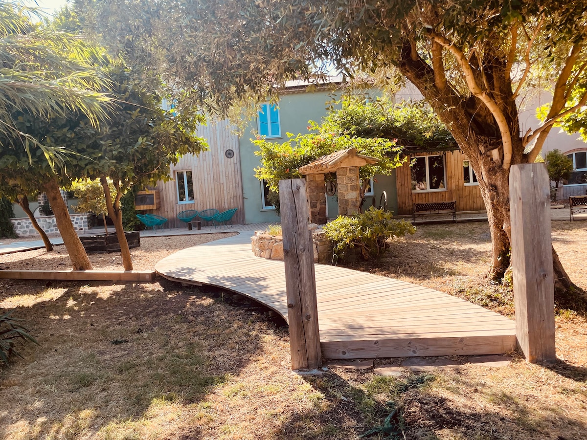 Descubra esta casa rural 100 % natural y su terraza ideal para relajarse bajo los olivos. En una paleta de tonos suaves de paja y piedra caliza, la bastida revela una armonía de materiales ecológicos y objetos artesanales con los colores de la Provenza. Podrá acceder libremente a la piscina de la finca (compartida con la segunda casa de la finca, La Chapelle) Sala de estar cocina abierta equipada 4 habitaciones con baño con ducha e inodoro (+1 aseo independiente en la planta baja) Ropa de cama, edredones y almohadas ecológicos, ropa de cama orgánica Terraza panorámica privada Acceso a la piscina de la finca Se trata de una parte de la Bastide con acceso independiente. La segunda parte de la Bastide está ocupada por los propietarios, pero orientada al otro lado. Una antigua capilla convertida en casa de campo también forma parte de la finca. Acceso a la piscina de la finca (Compartida con la segunda casa de campo de la finca) Una finca de 6 hectáreas plantada con más de 300 olivos centenarios que podrá descubrir con buenos zapatos. Un proyecto ecológico basado en 5 ejes principales: 1. Protección del patrimonio existente 2. Uso de materiales saludables y naturales 3. Limitación de energías 4/Gestión del agua 5/Gestión de residuos A 1,5 km del centro de la ciudad de Grasse, alójese en un remanso de paz típico de la Provenza, en medio de olivos y disfrute de unas vistas impresionantes de las colinas. Aeropuerto de Niza Costa Azul a 35 minutos. Estación de tren de Cannes a 20 minutos. Barrio de St François accesible en coche desde el centro de la ciudad de Grasse, en autobús (Línea 9 Jeanne Jugan) o incluso a pie ( 30 minutos con desniveles) La casa de los propietarios todavía está en obras pero no genera ninguna molestia.
