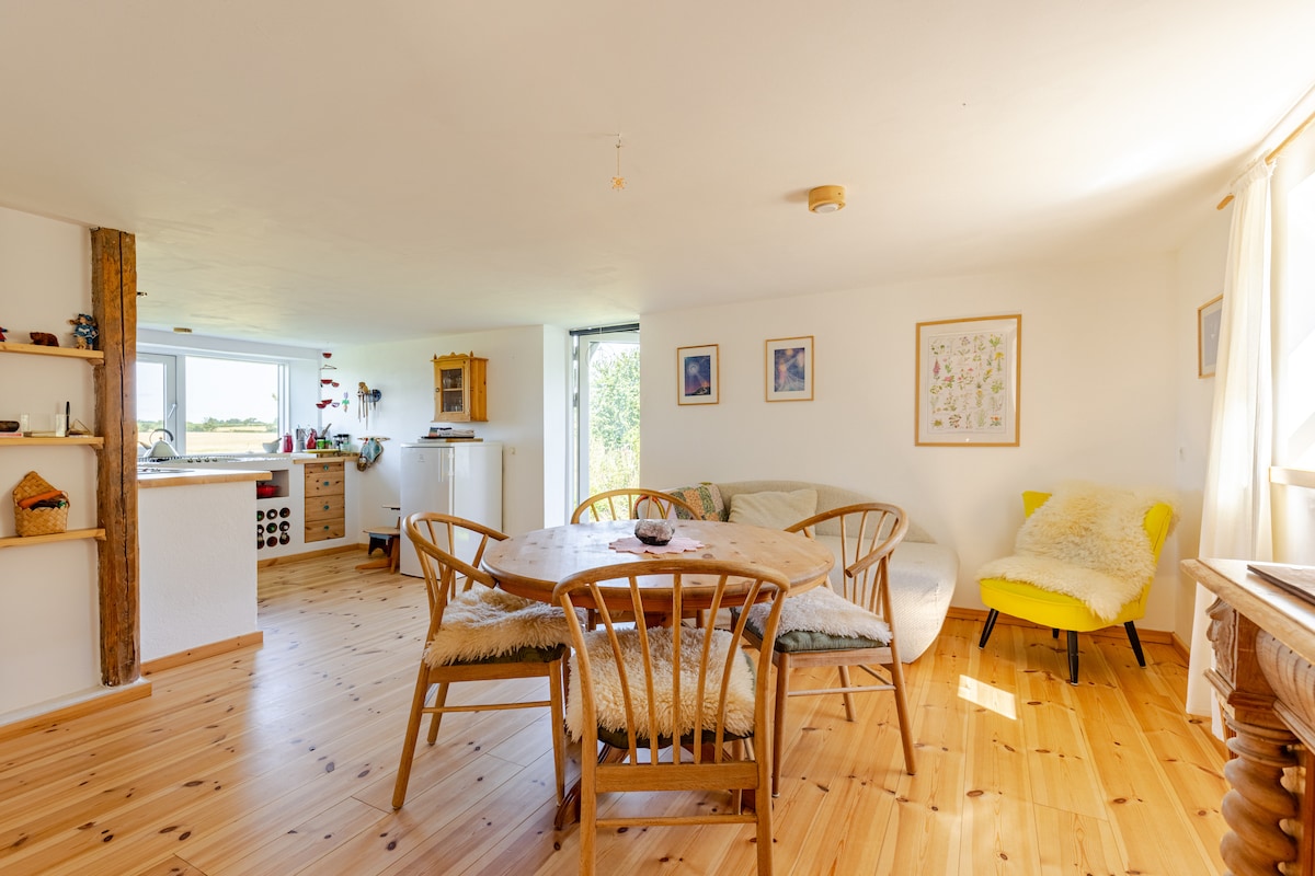 100 sqm newly renovated guesthouse on a biodynamic, self-sufficient farm with unobstructed, beautiful views over the rolling hills of Southern Zealand. Surrounded by a rich array of animals and plants with meadows, forest, and permaculture gardens, life is thriving. Visit the farm shop for fresh fruits, vegetables and unique treasures. A rare, peaceful place for quiet retreats, relaxation and magical nature experiences. Breakfast and dinner available upon request. Contact us for more info.