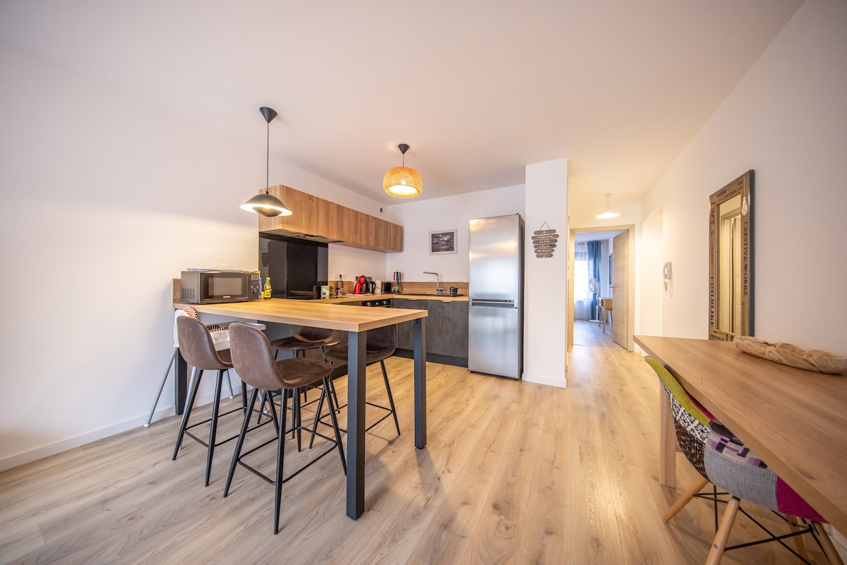 Profitez d'un logement élégant et central et parking privé. Vous pourrez aller partout à pied. 🚶♂️🚶♀️ Calme et spacieux, entièrement neuf (juillet 2024) et très bien équipé. Très grand salle de bain avec rangements. Un canapé convertible. 🛋 Vous venez en groupe ou en famille? Aucun problème. Profitez de 3 autres logements sur le même palier. Nous avons la capacité d'accueillir plus de 10 personnes côte à côte.