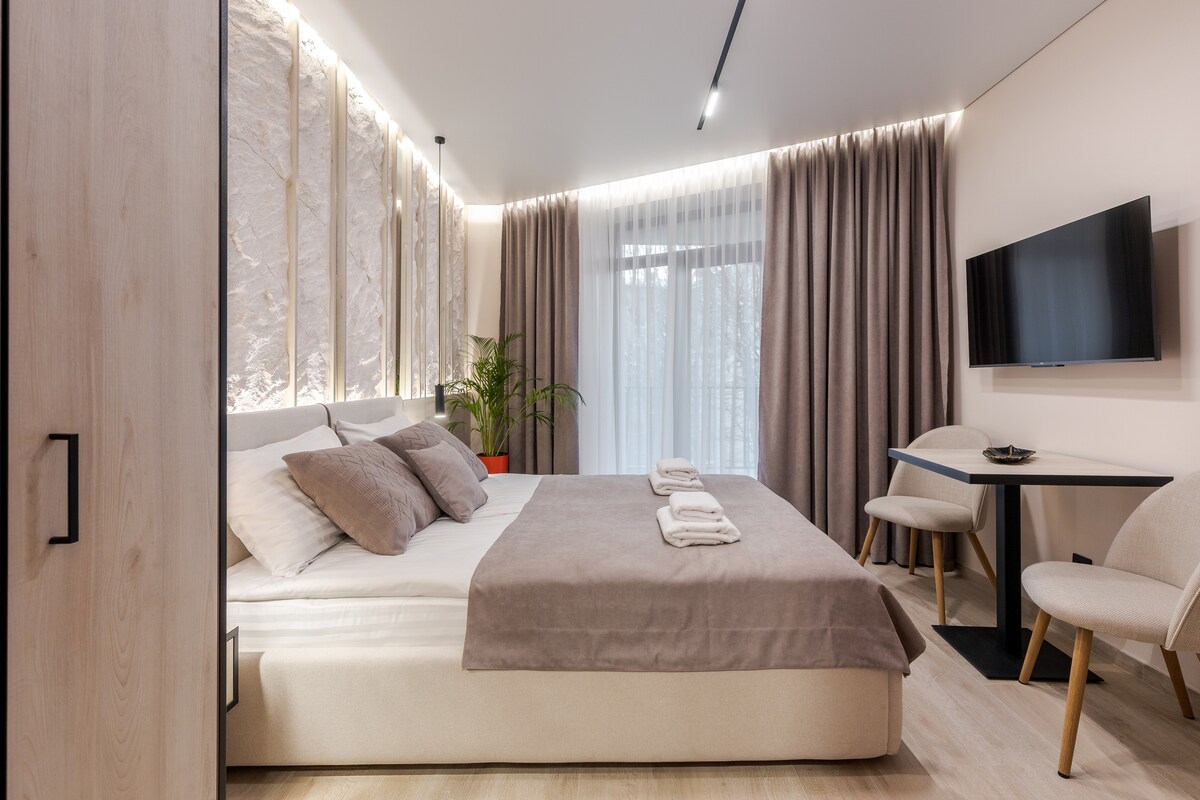 Elegante y moderno, el alma casera de Kostjukowski es el lugar adecuado. Apartamento de diseño en una zona tranquila en el centro de la ciudad. Un dormitorio y cocina, amplia terraza. Estacionamiento subterráneo gratuito, Wi-Fi, traslado gratuito desde/hacia la estación de tren o el aeropuerto, llenado de refrigerador, juego completo de cosméticos de marca, cesta de comestibles.