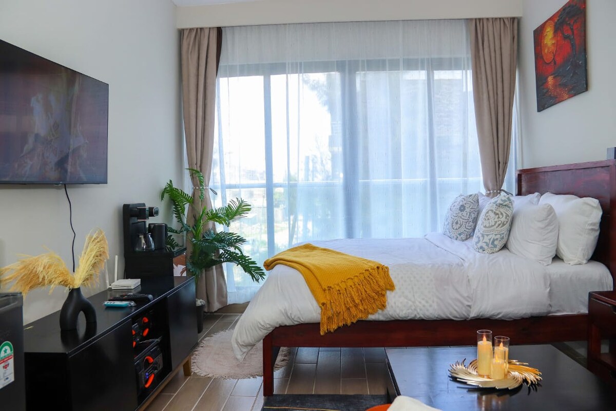 Karibu to your bright open-layout cozy studio apartment perfect for layovers or long stays. Just 8.7km from JKIA, 3.9km from SGR, 3.3km to the Expressway linking to Westlands 19km away (toll charges apply), and 1.8km to Gateway Mall. It's safe to check-in even late in the night with 24/7 security, elevator and keypad access. Features fast Wi-Fi, backup generator, queen bed, workspace, modern kitchen, free gym and pool access and complimentary housekeeping. Enjoy our Kenyan coffee and tea.