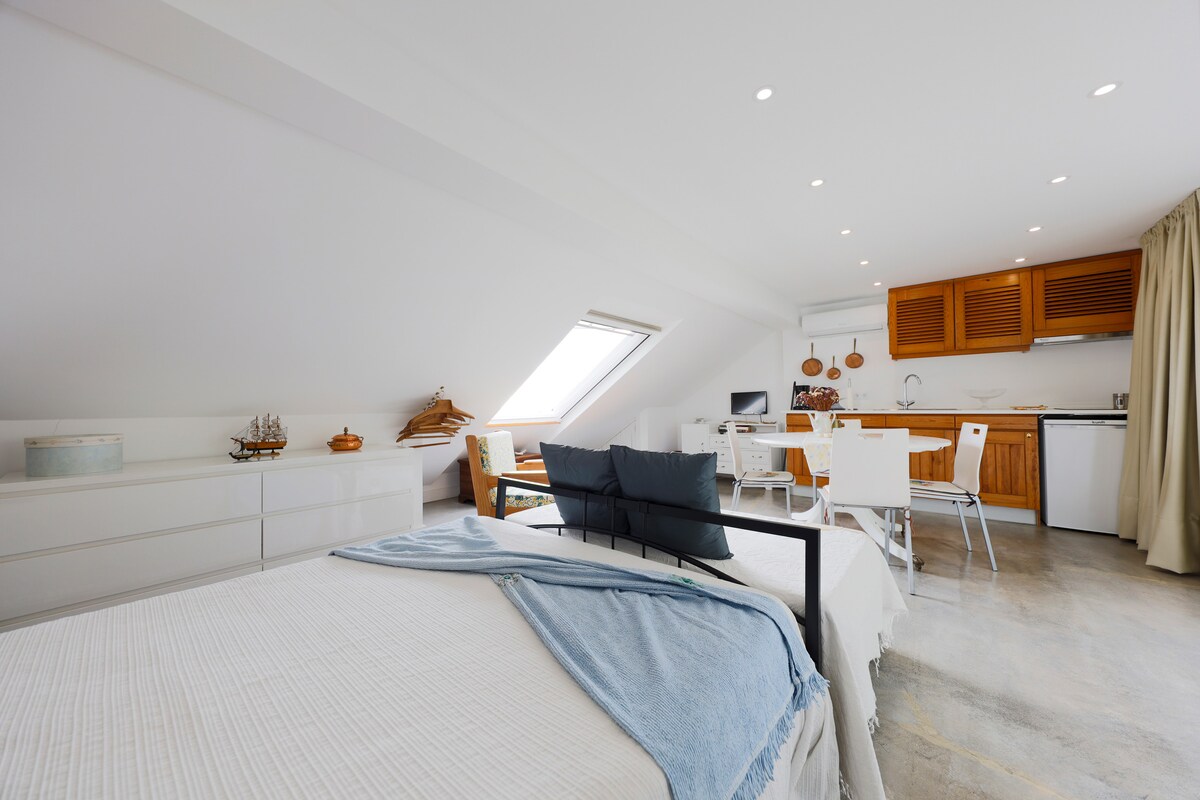 Es el estudio más encantador y espacioso que pudimos encontrar. Con unos 40 m2 y elegantemente decorado en miel, los tonos azules y blancos tienen todas las condiciones para una estancia única. Cuenta con una cama doble tamaño queen, zona de estar, cocina totalmente equipada y baño con ducha. Los 3 grandes ventanales de Rua dos Barreiros, lo convierten en uno de los lugares más luminosos de Casa do Mercado. Apartamento 2- Estudio T0 - capacidad para 2 personas | con vistas a la ciudad