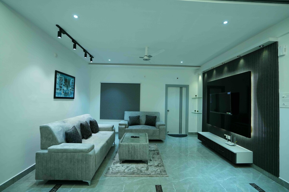 Luxurious, homely, secluded and only 5 mins from Hi-Tech City, this Full-Floor Apartment on the 2nd Floor is perfect for: - Family of 2-15 ppl, Wedding guests, NRI's etc, who need a centrally located home & daily maid service. - Remote working employees who need high-speed Wifi, a fully stocked kitchen & Inverter power back-up. - Couples who want a short term staycation & Chill in front of a 50" 4K-smartTV - Friends who need a private place to hangout in the city SELF-CHECK-IN using Smart Lock