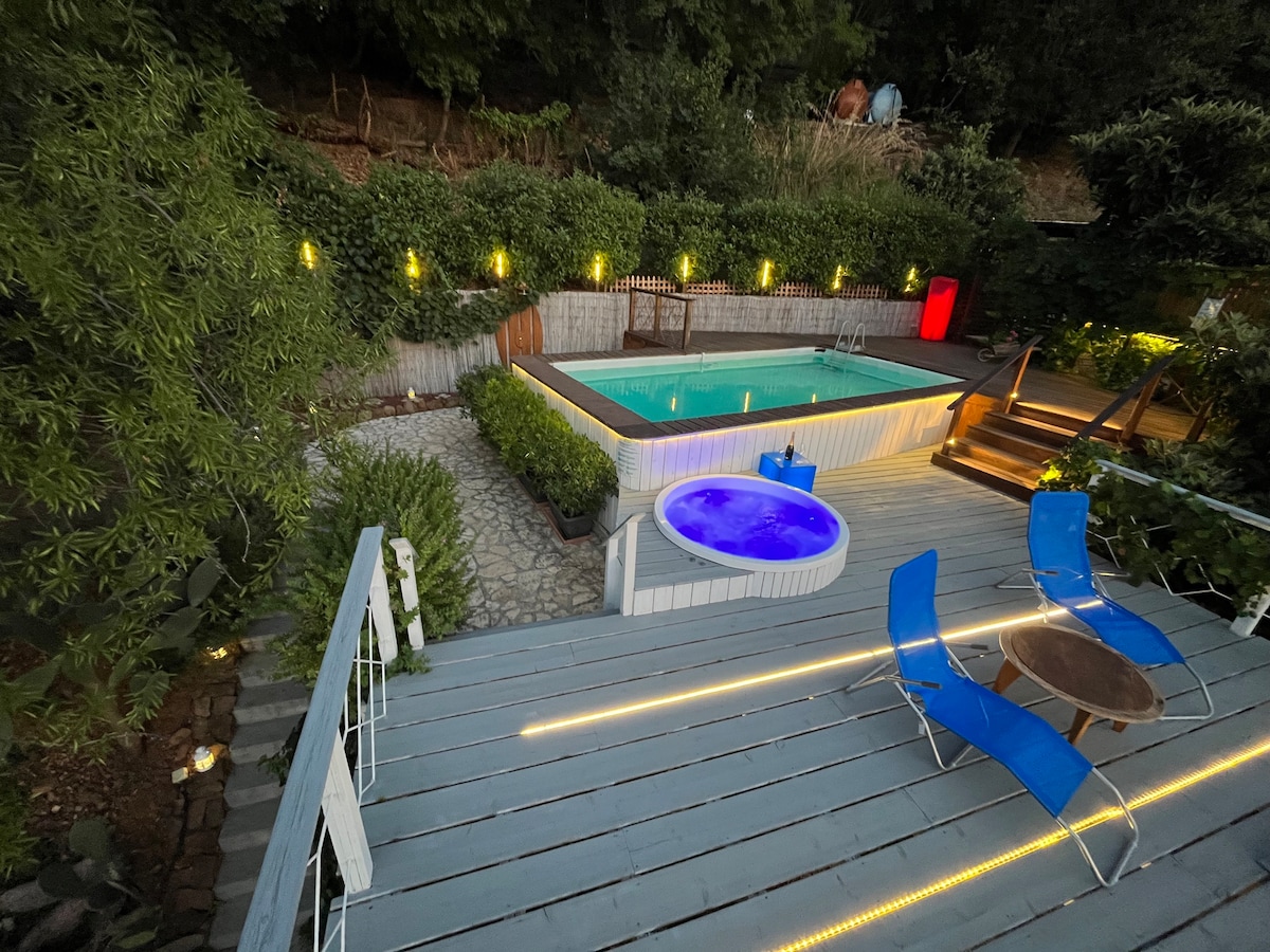 La casa tiene vistas a un amplio espacio abierto con una pequeña cocina al aire libre y un jardín con diferentes tipos de plantas mediterráneas y árboles que rodean la villa. En la planta baja hay una gran cocina y sala de estar con chimenea y sofá cama; arriba hay un dormitorio doble y uno con 2 camas individuales, una antecámara, un balcón, el baño. Todas las habitaciones tienen calefacción, ventanas (con red) y armario. Hay aire acondicionado en la planta baja y en el primer piso.