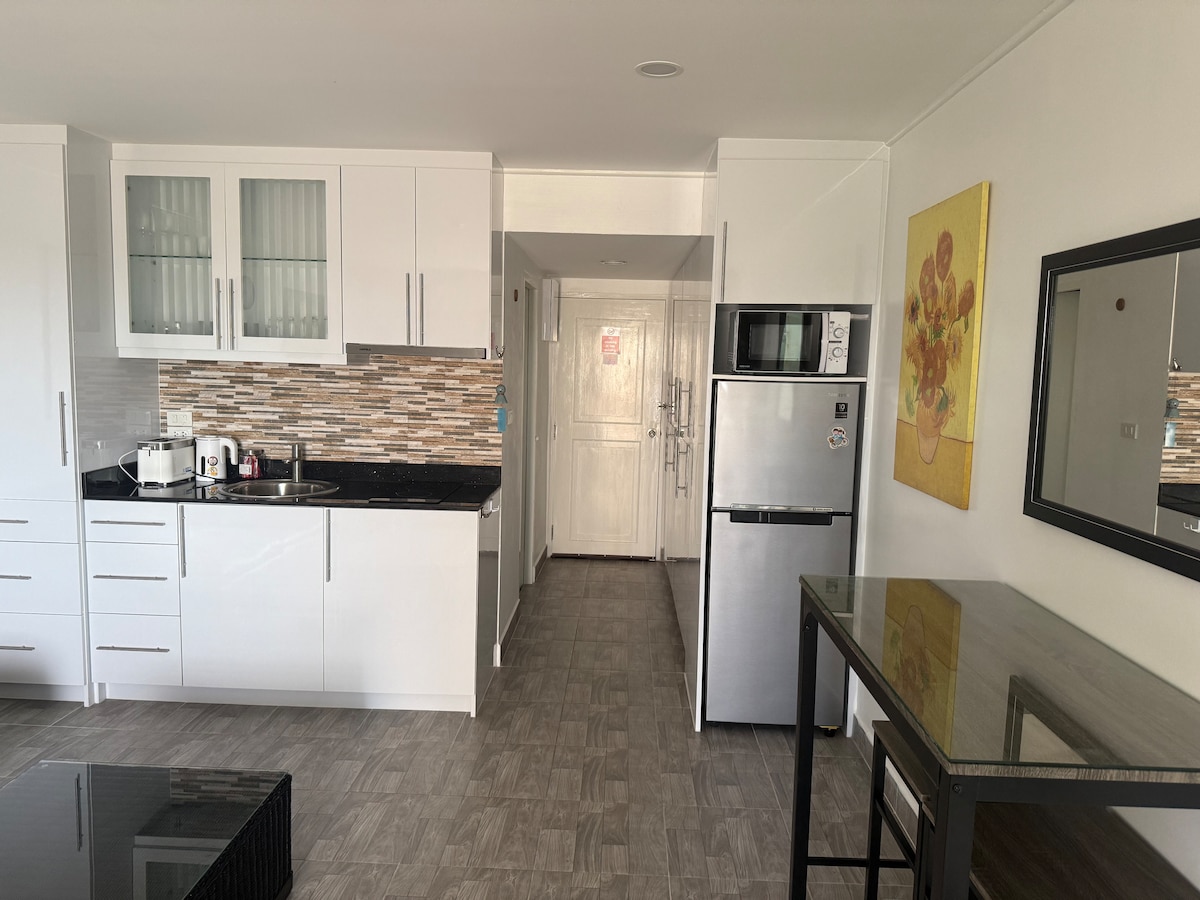 Beachfront! Beautiful modern studio apartment (40 sqm) on elevated ground floor, western style kitchen with an induction hob, complete kitchen equipment, pans, dishes, cutlery and a big fridge is provided. Large comfortable bed (king size), a large wardrobe with sliding doors, en-suite Bathroom with sink and hot shower is also available. Futhermoore a large Smart TV (55) and a balcony with a table and 2 chairs and direct view of the swimming pool and sea. Of course, Wi-Fi is included.