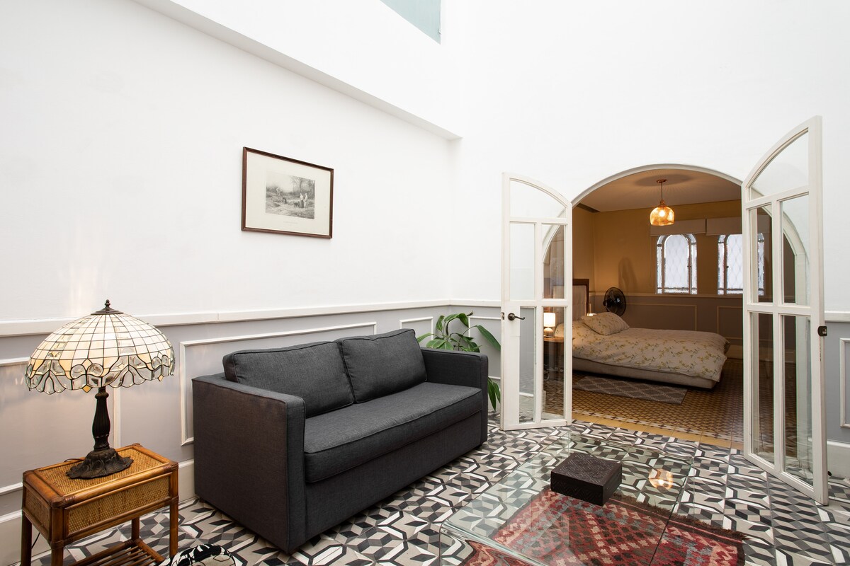 Jardín de tradiciones, ubicado en un edificio porfiriano en Roma N, decorado con referencias a tradiciones méxicanas. Cuenta con: baño espacioso y equipado; lavadora estratégicamente ubicada; cocina equipada con parrilla, microondas, y refrigerador; comedor con mesa y sillas para cuatro personas; Sala de estar con sofá y sillas para relajarse. Habitación principal con cama king-size, ropero, TV y aire acondicionado. Acceso al jardín desde la sala y la recámara. Ideal para estancias prolongadas.