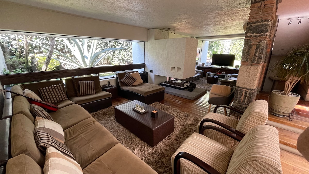 Cozy forest SUITE, views of nature, volcanoes, city, sky. Mountain magic. Chimney. Relax and enjoy in a safe environment, 1100m over Mexico City. 40 minutes from Interlomas and Toluca. Ideal for a love, family or friend’s getaway. Get inspired, hike, homework, or acclimatize to the altitude for a competition. Sunny hillside. Country houses area with surveillance, near new highway. Living room, fireplace, dining room, kitchenette, 2 bedrooms, 2 bathrooms, hot water, grill, screen, Wi-fi.