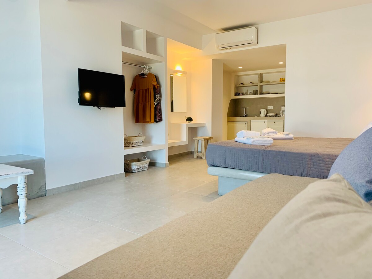 Stylish & cozy studio 45m², with sea & sunset views! A brand new studio with a large double bed, a comfortable built-in sofa/bed, kitchenette & shower bathroom. The studio opens to its own garden terrace fitted with sofa & coffee table. We welcome you with fresh fruit, wine, ‘souma’ (our local drink) & breakfast items. Enjoy the outdoors in the garden with sitting corners under the trees. The beach is just 700m away! Free transport to/from the port upon request.