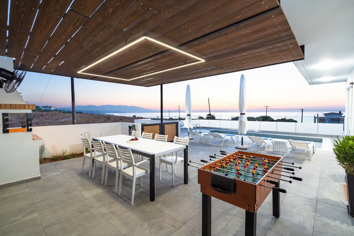 Alquiler exclusivo seguro de Elia Villa, un refugio de lujo con impresionantes vistas al mar y actividades al aire libre a medida. Disfruta de la piscina al aire libre con funciones de hidromasaje y una piscina infantil. La cocina exterior totalmente equipada y la zona de barbacoa son perfectas para comidas gourmet con impresionantes vistas. Los servicios recreativos incluyen un parque infantil, una mini cancha de baloncesto y una mesa de ping pong. Con capacidad para hasta 14 huéspedes, Elia Villa promete un entorno exclusivo y opulento para unas vacaciones inolvidables.