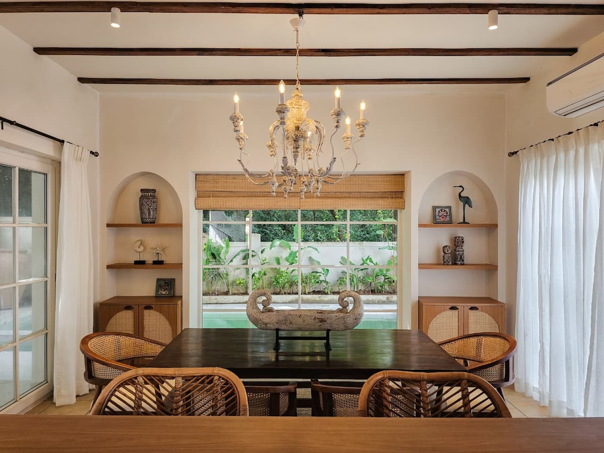 Ubicada en la exuberante vegetación de Siolim, SolVanya by evaddo es una villa serena de 2BHK con piscina privada que ofrece privacidad, comodidad y conveniencia. Un jardín ajardinado conduce a la villa, donde las ventanas de vidrio del piso al techo aportan luz natural y vistas impresionantes. Ideal para familias y grupos pequeños, cuenta con 2 dormitorios en suite y un escritorio de trabajo dedicado, con capacidad para alojar cómodamente hasta 6 huéspedes. Cerca de Anjuna y Morjim, es perfecto para un refugio tranquilo o para explorar la vibrante vida nocturna de Goa.