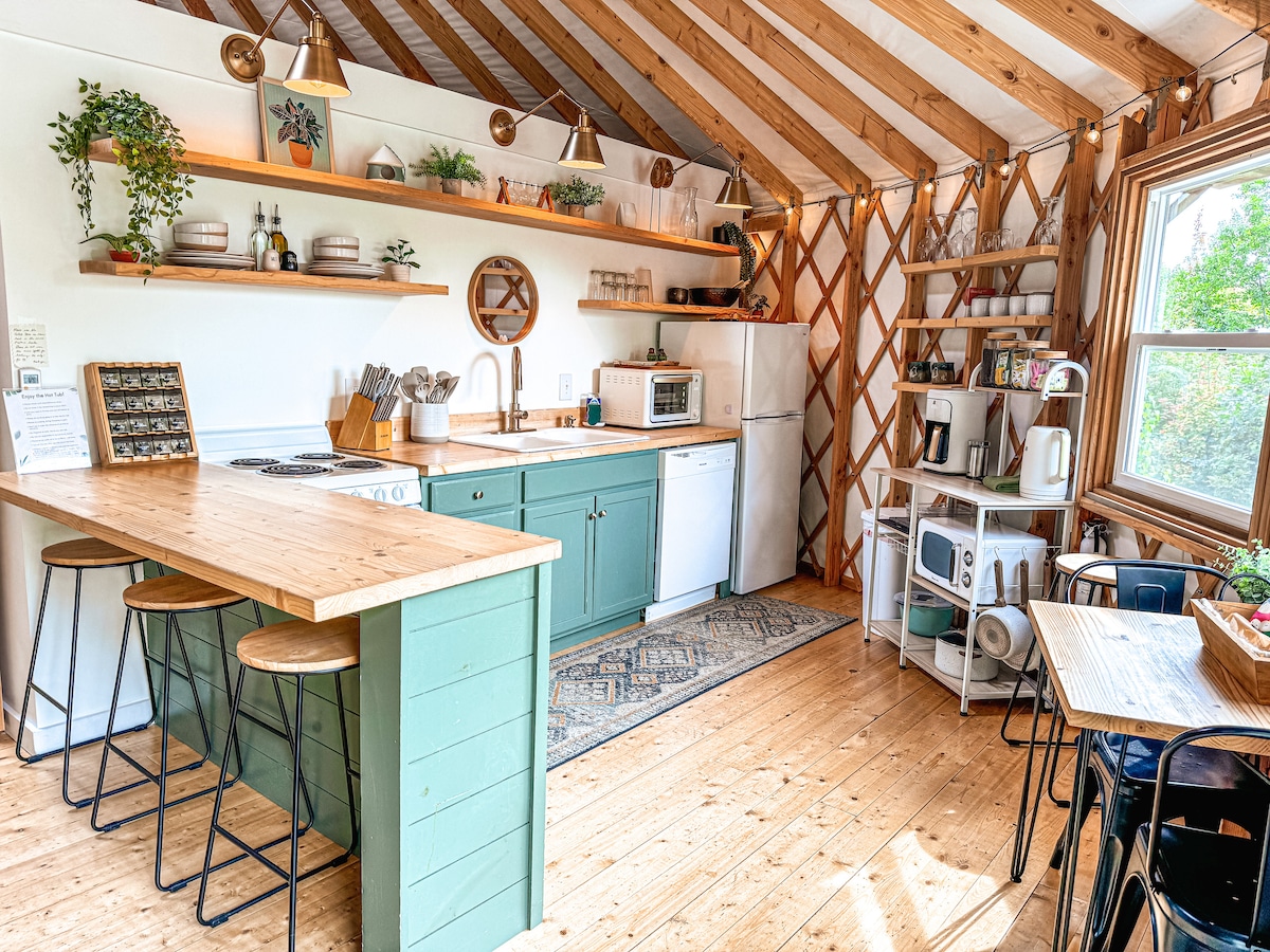 Nuestra yurta está hecha a mano. Cada registro se peló y se dividió para crear el trabajo de celosía inicial. El interior está revestido de madera contrachapada delgada y pintada, lo que le da una sensación más hogareña que una típica yurta cubierta de lona gomosa. :) Hay una gran claraboya abovedada en el centro para dejar entrar la luz del sol. También puedes abrir la ventana hexagonal para dejar entrar aire fresco. En el interior encontrarás una cama doble elevada, mantas adicionales y un colchón futón para fiestas más grandes. La cocina pequeña es ideal para cocinar básica.
