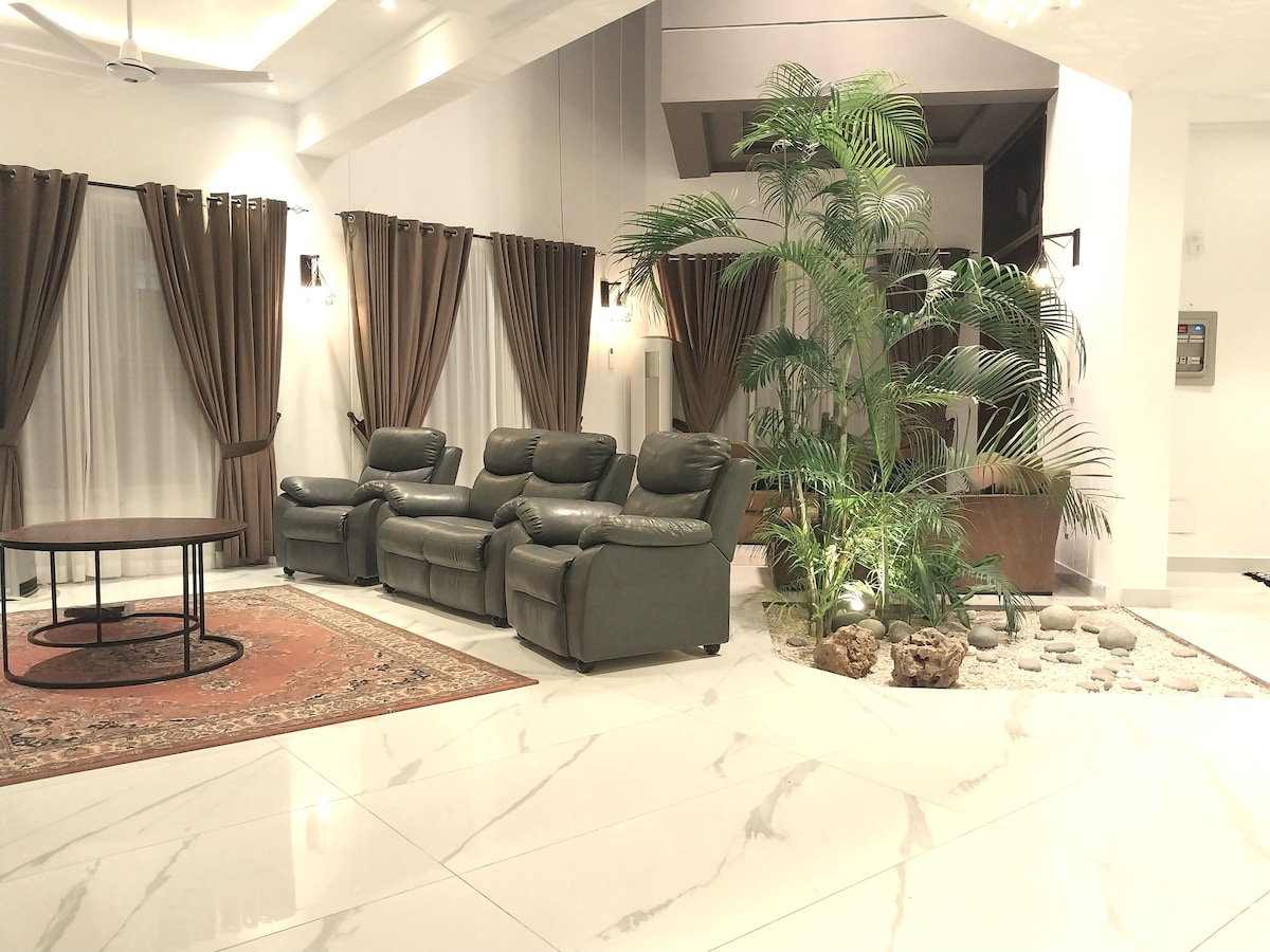 Relájate y disfruta de un retiro de lujo ofrecido por ComfyCozy. Esta moderna villa está en un exuberante Bahria Enclave Islamabad . Aunque gran parte del entretenimiento se encuentra dentro de Bahria Enclave (pajarera/zoológico), está a solo 10 minutos en auto de las fuentes danzantes de Park View Society, del vibrante Food Valley y del lago Rawal, lo que hace que su estancia sea aún más emocionante. La tienda de comestibles se entrega en la puerta y agrega comodidad. También puede acceder al GIMNASIO con tarifas especiales con descuento.