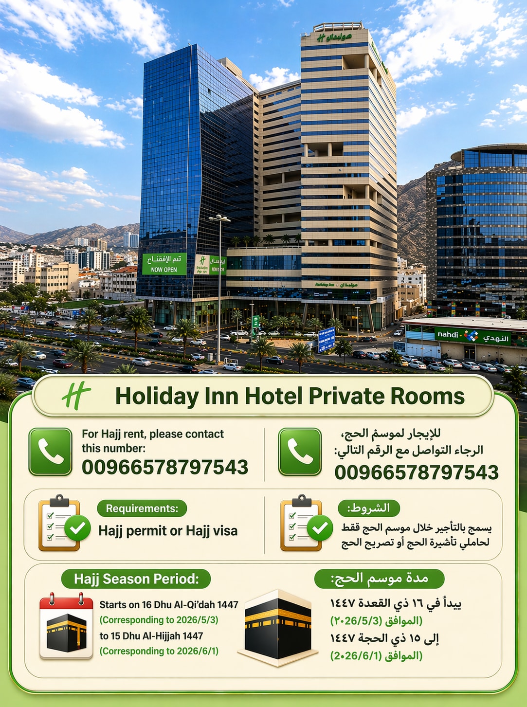 Welcome to the 5-Star Holiday Inn Hotel in Aziziyah – Prime location from supermarkets, cafes & all your daily needs are within walking distance ➤ Your private & elegant room blends modern comfort with authentic hospitality. ★ 24/7 Shuttle & Easy Access – Reach Masjid Al Haram in just 5 minutes by taxi or 9 minutes via FREE shuttle buses running around the clock. ★ Clean, Modern & Private – Dedicated floor access with elevators, a spotless room, premium bedding & thoughtful lighting