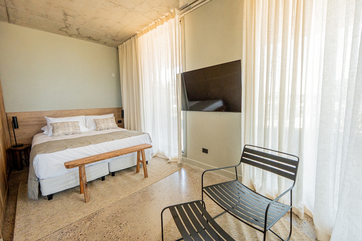 Nuestra Habitación Deluxe con terraza ofrece un espacio único y elegante, ideal para quienes buscan una estadía especial en el entorno relajado de José Ignacio. Con 55 m², combina amplitud, confort y estilo en cada detalle. Puede prepararse con cama matrimonial o dos individuales, y está equipada con todo lo necesario para disfrutar de una experiencia exclusiva y placentera en Casa Chica.