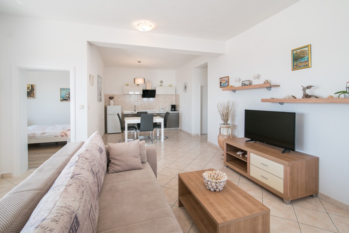 Apartman je u prizemlju kuće, okružen zelenilom i ima hladovitu terasu. Do plaže 150 m, do centra i trgovina oko 300m. Parking u dvorištu. Apartman ima dvije sobe, veću sa bračnim krevetom i manju sa dva odvojena kreveta. Kuhinja je opremljena - hladnjak, frizer, mikrovalna pečnica, kuhalo za vodu, plinski štednjak, suđe i pribor za jelo. Kupaonica sa tušem i WC. Klima uređaj. Kućni ljubimci su dobrodošli. Boravišna pristojba po osobi 1,5€/dan.