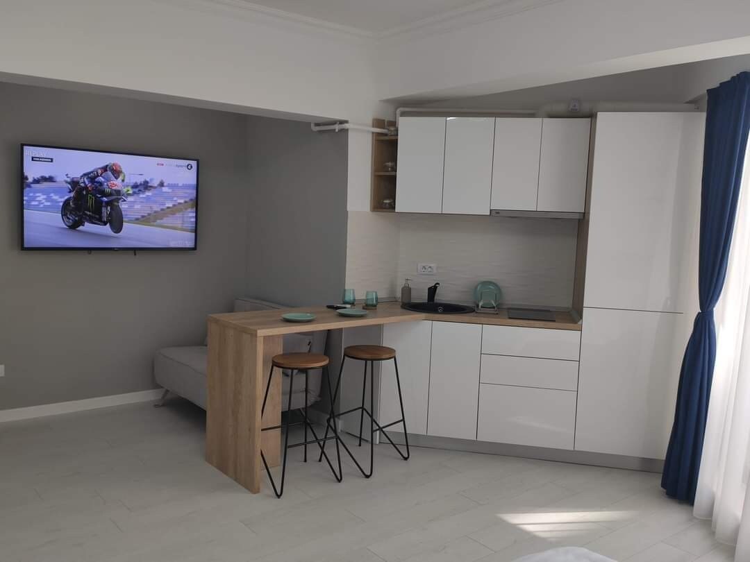 Apartamento estudio de lujo, ubicado a solo 50 metros de la playa, con vistas al mar en el paseo marítimo Navodari Camp la. Esta casa de 50 pies cuadrados es moderna y cómoda. Te proporcionamos un apartamento de 2 habitaciones que consta de un dormitorio con una cama matrimonial y una sala de estar abierta con un sofá extensible. La cocina está amueblada y equipada con nuevos electrodomésticos de la mejor calidad. La propiedad tiene lugares de estacionamiento privados con acceso a la barrera.