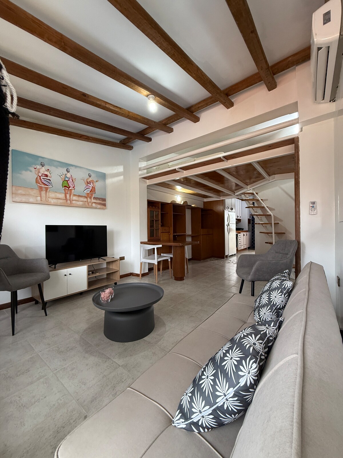 Apartamento muy acogedor. Cuenta con todo lo que se necesita para pasar unos días cómodos, relajados y felices en la Isla de Margarita. Tiene 2 habitaciones una con cama Queen, baño privado y Tv y la otra es una habitación pequeña con cama matrimonial ubicada frente a la sala donde hay un Smartv. Adicional hay un sofá cama útil por si vine una persona más con el grupo. Hay un baño completo y una bella cocina Equipada. La Terraza es el lugar que se roba la atención de todos.