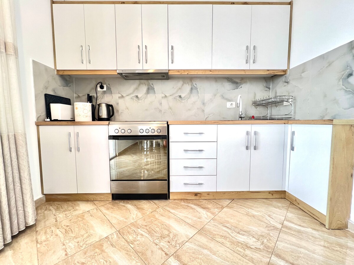 El departamento se encuentra en un edificio nuevo, con muebles nuevos y modernos y con todas las comodidades necesarias. Ubicado en la zona turística No. 1 de Saranda, con algunos de los mejores restaurantes, balnearios y las playas más limpias y seguras como "Mango Beach", "Santa Quaranta", etc. El apartamento está orientado al mar y puedes disfrutar del mar Jónico, así como de Corfú de fondo. La limpieza es ejemplar y nuestra hospitalidad siempre estará al máximo. Esperamos hospedarte lo antes posible.