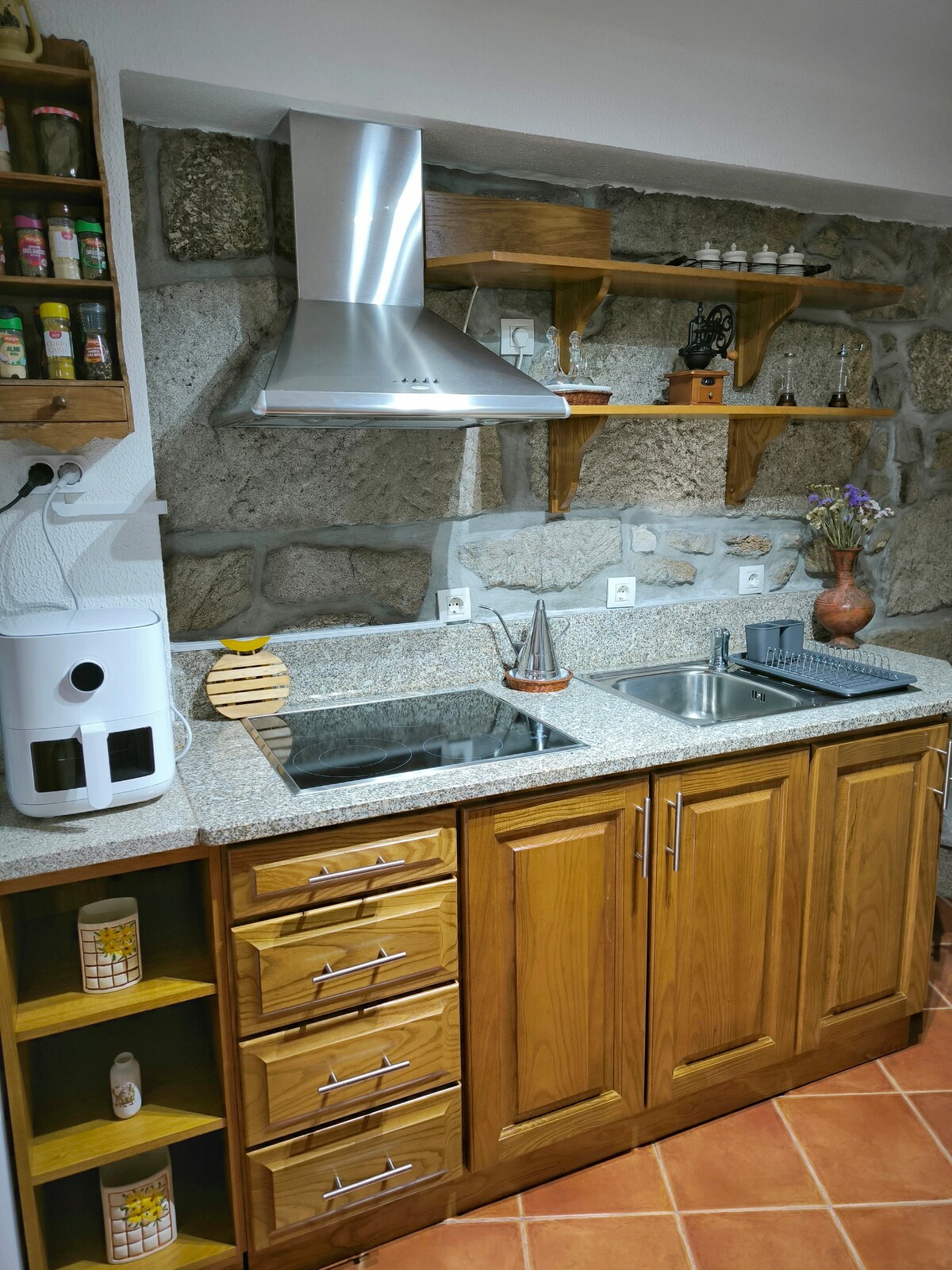 En la parte superior de la casa vive la pareja propietaria. La parte inferior de la casa es muy espaciosa, ideal para una pareja o dos y con hijos y pueden traer a su perro. El espacio de alquiler está rodeado de un hermoso bosque de robles. La sala de estar y la cocina permiten disfrutar de la naturaleza, en el interior, junto al calor de la chimenea, o fuera, en un espacio exterior con mesa y sillas. La barbacoa permite otro tipo de comida y un horno de leña si quieres hacer nuevas experiencias.