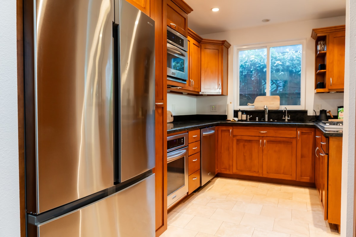 Disfrute de mañanas soleadas en nuestro tranquilo y acogedor patio trasero. Nuestra casita se terminó de construir en 2021 y cuenta con un amplio dormitorio con una cama king size con sábanas de 100 % algodón y edredón de plumas, un baño grande con tocador con lavamanos doble, cocina completa y sala de estar. El patio trasero te ofrece varias oportunidades para que levantes los pies y te relajes después de un largo día de exploración.
