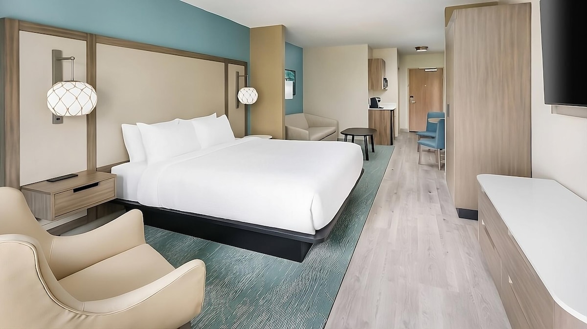 Nuestra suite estándar tamaño king de un dormitorio te ofrece todas las comodidades de un alojamiento con balcón privado con vistas a los terrenos del hotel. Todas las suites Standard tienen un dormitorio privado con una cama tamaño king con colchón de espuma viscoelástica y un sofá cama en la sala de estar. Cada suite está equipada con una sala de estar completa y un comedor, con dos televisores de pantalla plana de 42 pulgadas y un escritorio con estaciones de carga USB. La cocina americana totalmente equipada te ofrece cena y artículos de plata, tazas y vasos, mininevera, microondas y cafetera. El baño privado tiene duchas de azulejos personalizadas y artículos de baño de diseño en Hydra Spa.