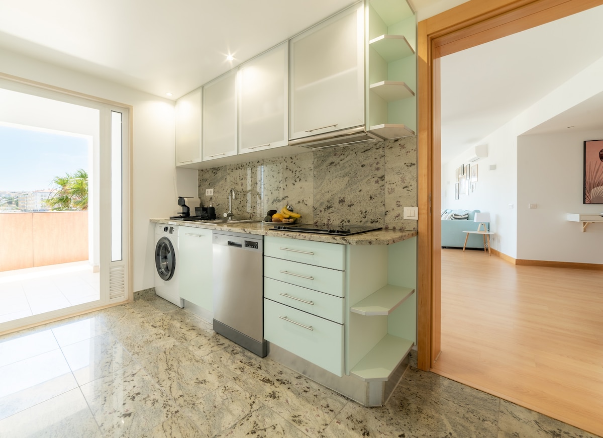 Un espectacular apartamento con terraza privada en la azotea con vistas al mar y al puerto deportivo de Lagos con 2 dormitorios, 2 baños, wifi, aire acondicionado y aparcamiento subterráneo. Con una gran terraza en la azotea con vistas a todo Lagos, el apartamento está orientado al sur/este, totalmente amueblado, cocina totalmente equipada, 2 baños, salón y comedor. A solo unos minutos a pie por el puente peatonal del puerto deportivo y a 8 minutos a pie del centro histórico. Encontrarás la playa más cercana, Praia Batata, a solo 15 minutos a pie. Meia Praia está a 1 km.