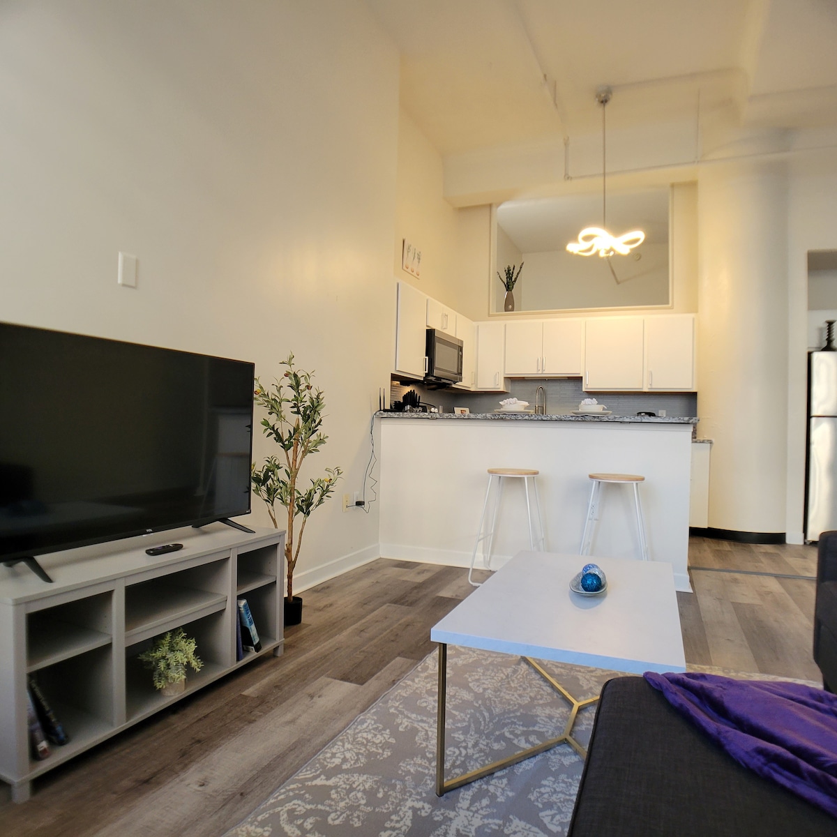 Ubicado en el centro de la ciudad, este apartamento te conecta con el estadio Lucas Oil, el Centro de Convenciones, Gainbridge Fieldhouse, restaurantes de 5 estrellas y a pocos pasos del White River State Park. Totalmente amueblado con muebles Ashley, este apartamento cuenta con una cama tamaño queen con tocador, sala de estar con sofá modular y una vista de prestigio de las calles de Indianápolis, y una cocina con un juego completo de utensilios y electrodomésticos. Disfruta de wifi gratuito y de un baño después de usar el gimnasio y el teatro de la 6.ª planta.