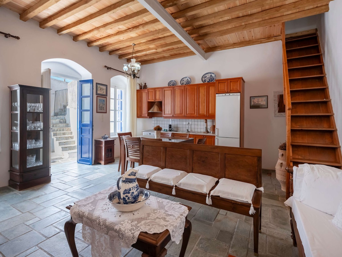 A traditionally renovated, neoclassical building, situated in a traditional square in the Cycladic village of Marpissa. Enjoy your holiday living in a quiet neighborhood, wander around whitewashed alleys, visit traditional tavernas, and folklore museums. Conveniently located in the center of the village and within walking distance from the market street and the crystal clear water beaches of Piso Livadi and Logaras.