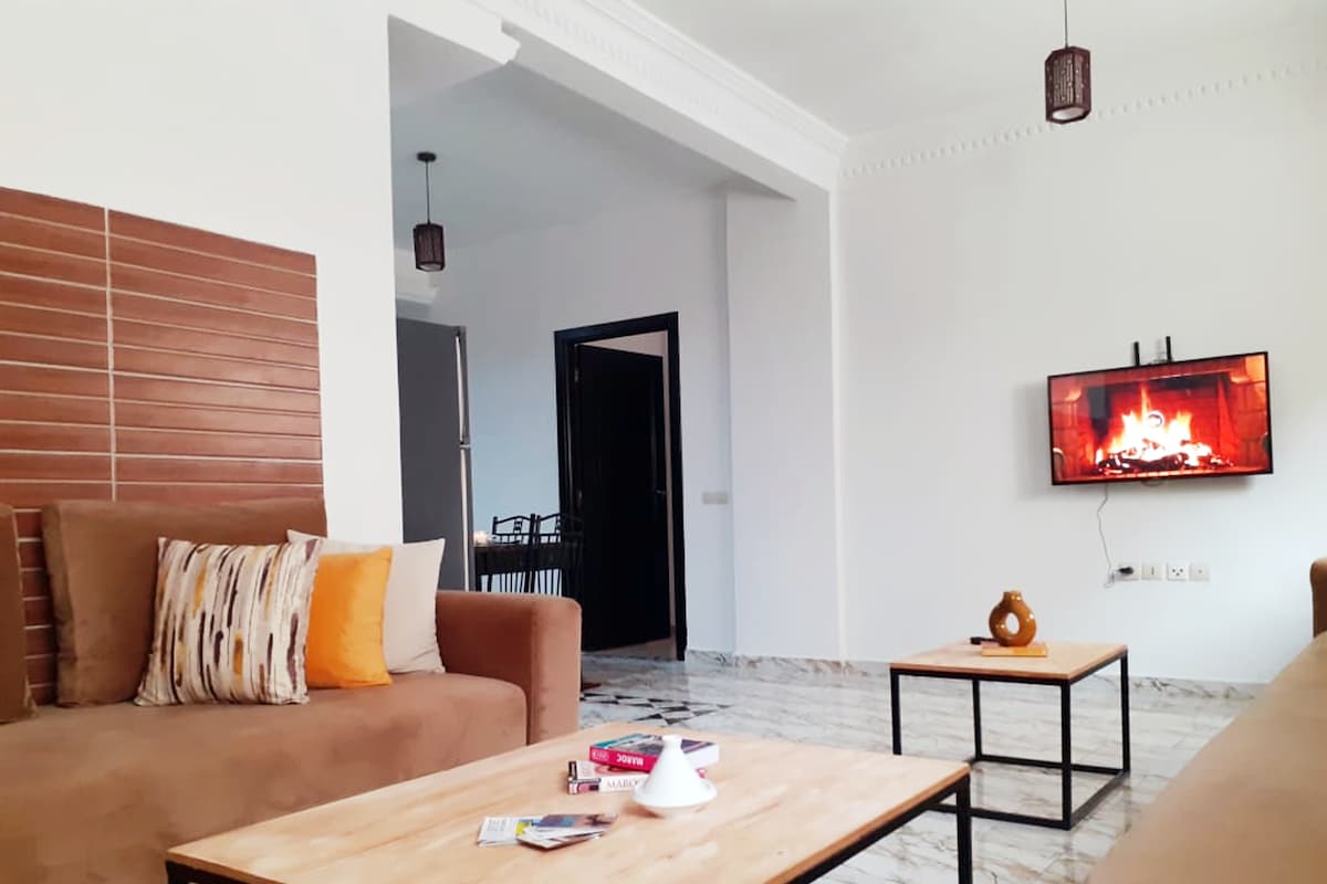 Bienvenue à Essaouira Installez-vous dans un appartement confortable et spacieux, situé à la Résidence Jawhara, une résidence calme et sécurisée 24h/24 avec parking gratuit juste devant. À seulement 4 minutes à pied de la plage, c’est le logement idéal pour profiter d’Essaouira sans voiture, tout en restant à l’écart du bruit touristique.