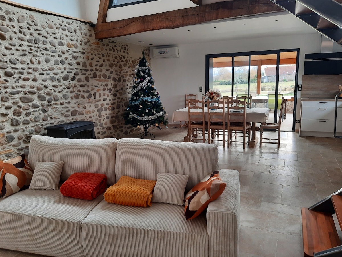 Chalet avec une vue spectaculaire sur les Pyrénées. 2 chambres (1 lit double avec ensuite, 2 lits simple), 2 salles de bains (1 douche et 1 baignoire), terrasse avec auvent, jardin Les chiens sont les bienvenues (conditions à voir ensemble) Maison bien placé entre les montagnes et les villes, très bons chemin de balade à vélo ou à pied ATTENTION ⚠️ nous avons un domaine équestre ( écurie de propriétaire) nous ne proposons pas d’activités autour des chevaux