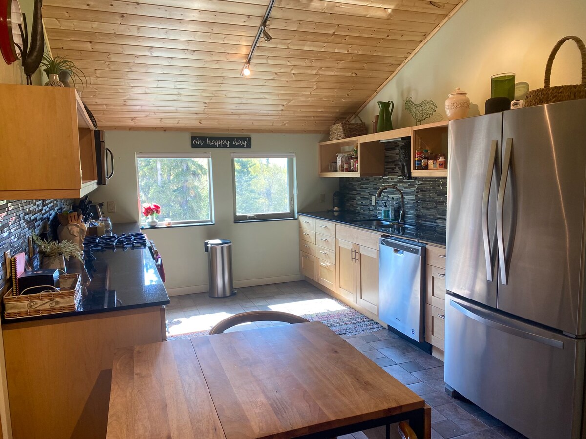 El nivel inferior de nuestra casa Jewel Lake con una entrada independiente y un divertido patio trasero. Esta es una remodelación reciente; un espacio ecléctico con techos de madera vintage y una mezcla de detalles industriales y modernos. Estamos a 5 minutos en coche del aeropuerto, y los huéspedes pueden disfrutar de la naturaleza salvaje de Alaska desde este espacio. Un sistema de senderos boscosos se encuentra justo detrás de nuestra casa para caminar y andar en bicicleta. Los huéspedes pueden recoger huevos de nuestras gallinas, usar nuestra bañera de hidromasaje junto al bosque, avivar el fuego o usar tablas de paddle en Sand Lake.