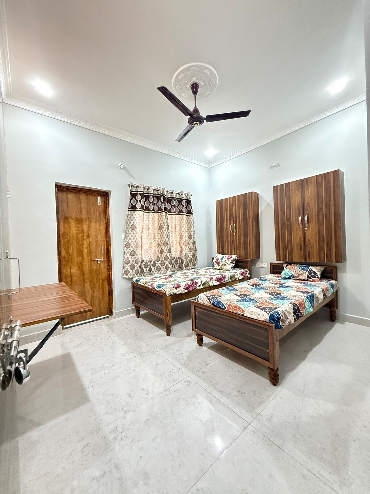 Madhuvan tiene 3 dormitorios en el primer piso. 2 habitaciones tienen baños adjuntos. El límite de 5 personas puede superarse previa solicitud con camas / colchón adicionales. Madhuvan es una casa tradicional, con comodidades básicas. Áreas comunes que compartirán todos los huéspedes, propietarios: - Sala de reuniones de oficina, - 2 balcones grandes - Despensa de autoayuda, lavadora, El balcón delantero da a Marine Drive, el lago más famoso de Raipur, dominado por el Tiranga más alto de la India y el exuberante jardín verde. El balcón trasero está abierto al cielo para secarse.
