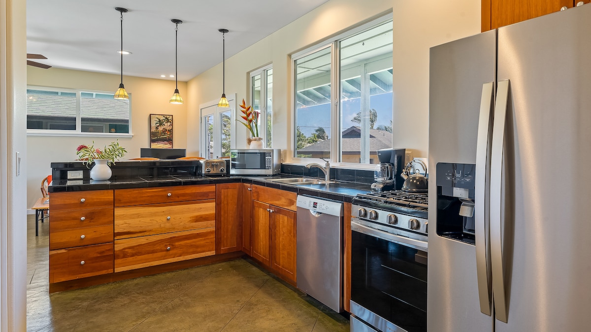 El Ha'iku Hale está cuidado por una familia local que busca defender los valores de la cultura hawaiana. Diseñado para ser un santuario en medio del paraíso para retirarse y rejuvenecer. Con 3 dormitorios y 2 baños, el Hale puede alojar cómodamente hasta 6 personas. El dormitorio principal de Hale tiene una lujosa cama tamaño king, aire acondicionado y baño privado. ¡Ubicado a pocos pasos del centro de conservas de Ha'iku para que puedas cenar y comprar fácilmente! A 10 minutos de Ho'okipa, ¡perfecto para surfistas!