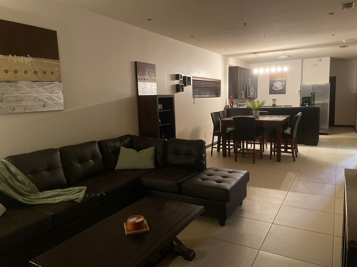 Amplia casa adosada en North Mcallen, a 1 milla de DHR y Uptown con una gran piscina. 4 dormitorios de tamaño texano y un sofá cama en la sala de estar nos permiten dormir cómodamente 14 personas. Haz una barbacoa, relájate y descansa en nuestro patio privado mientras ves el gran partido en nuestro televisor de 55 pulgadas al aire libre. Ven y disfruta de una vida de lujo con una piscina comunitaria y un jacuzzi justo delante de nuestra puerta principal.
