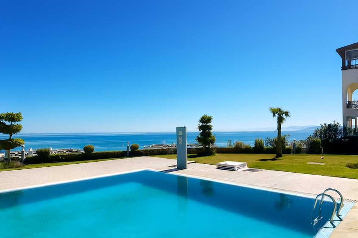 Villa de lujo con piscina grande privada auto-limpiante a 5 km de Cabo Negro y a 3 km del aeropuerto de Tétouan y McDonald’s. Con 2 habitaciones y 2 salones (uno con 4 sofás cama) para 7 adultos, cocina equipada, baño modernos, jardín con iluminación que se enciende al atardecer, zona de barbacoa y parking para 3 vehículos. Limpieza y mantenimiento garantizados. No se permiten fiestas , solo huéspedes respetuosos. Incluye climatizador automático