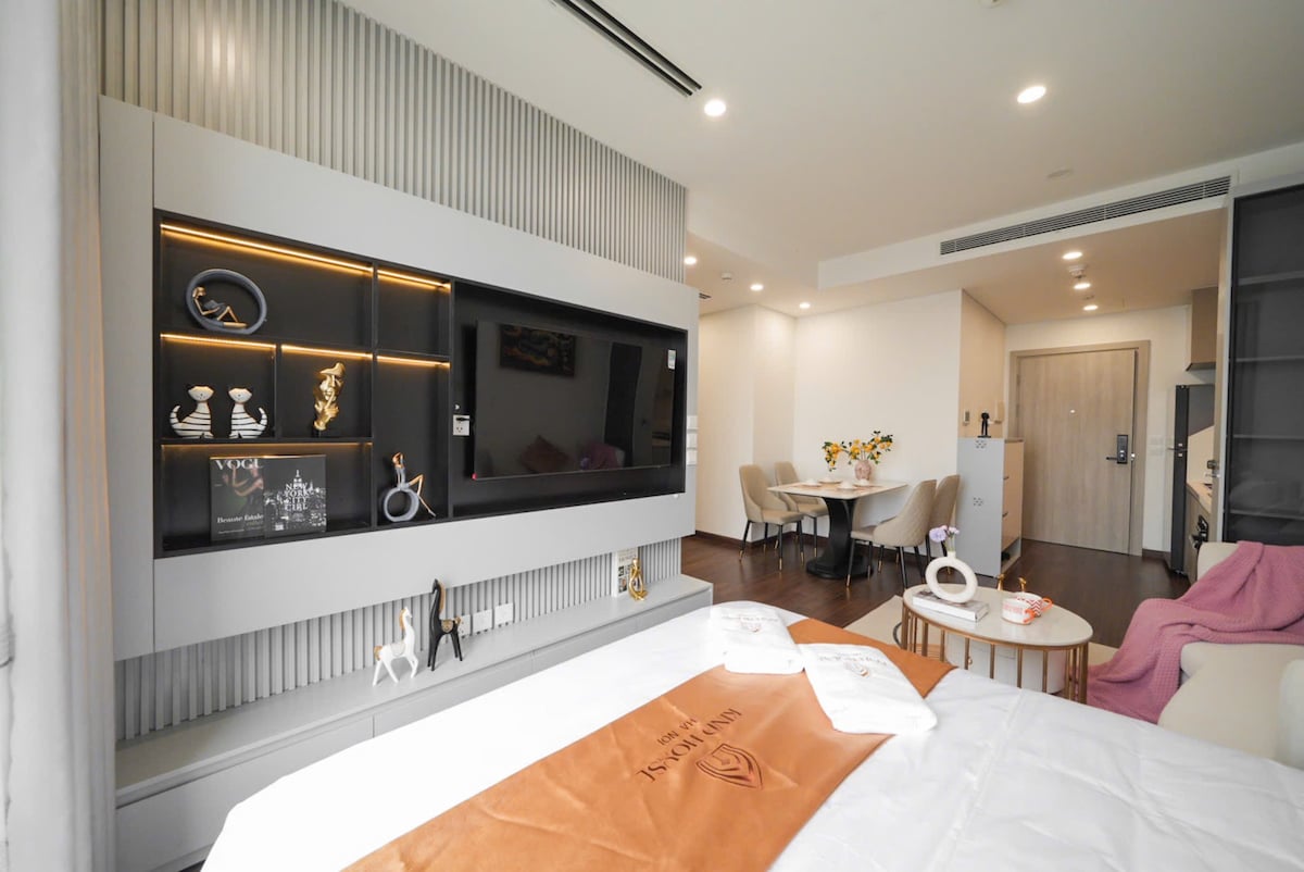 Hello! Your studio apartment is 38m2 high-class like a luxurious and charming 5-star hotel with a comfy bed, private bathroom, kitchenette and a balcony overlooking the West Lake. Especially, you have access to a high-class gym, swimming pool and sauna. Are you traveling, on business trip or simply looking for a private and romantic place? It is a great choice for you, Let’s come and experience! We’re excited to see you here! Best regards, Luxury Econest team