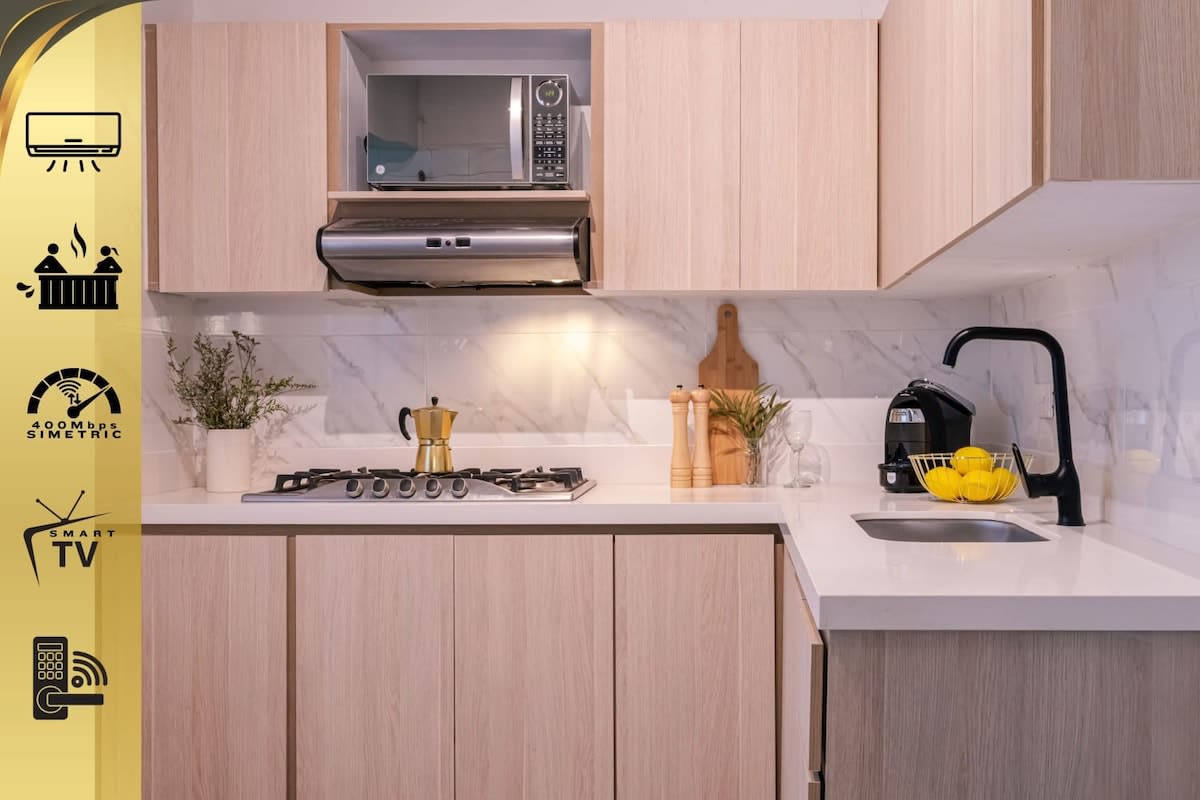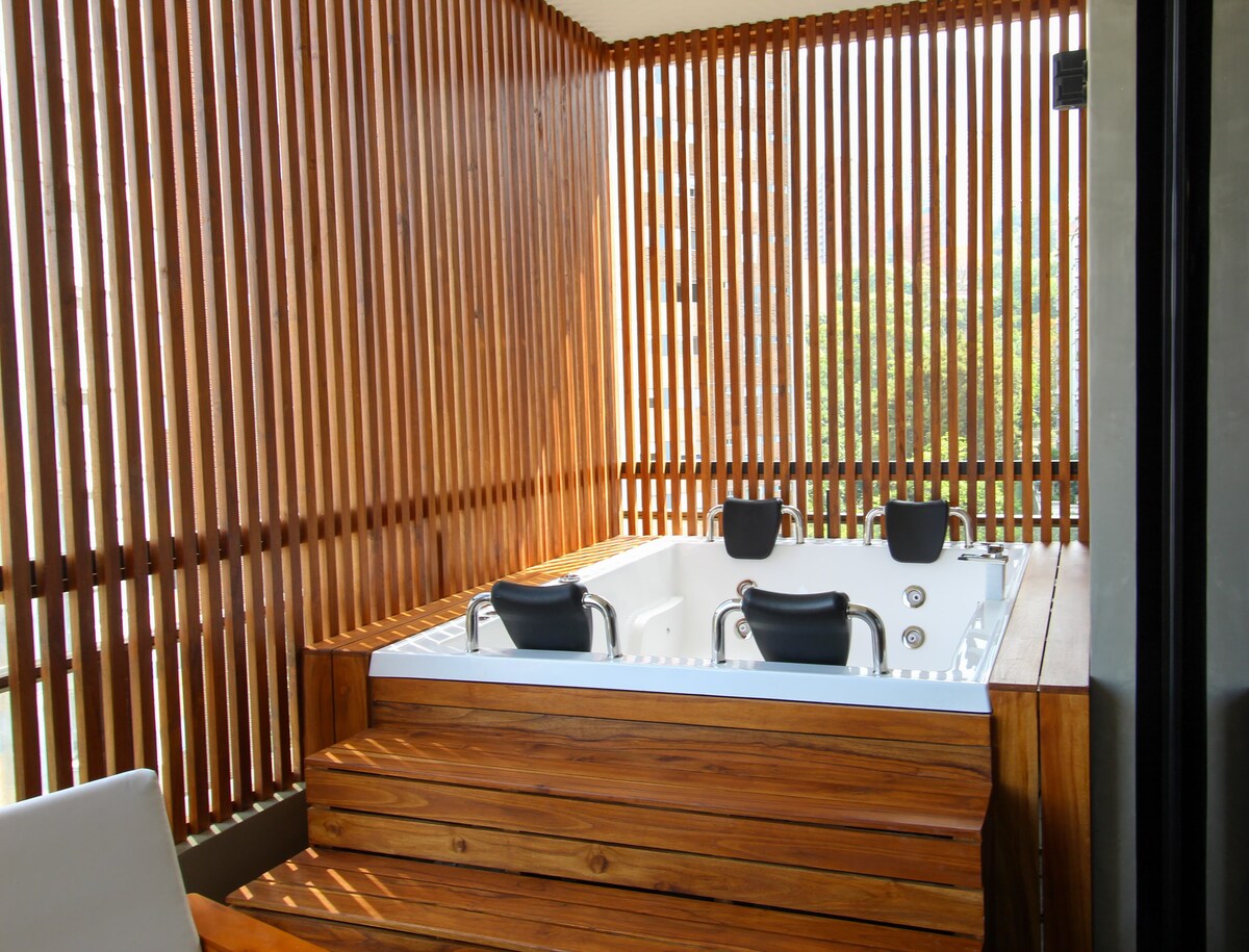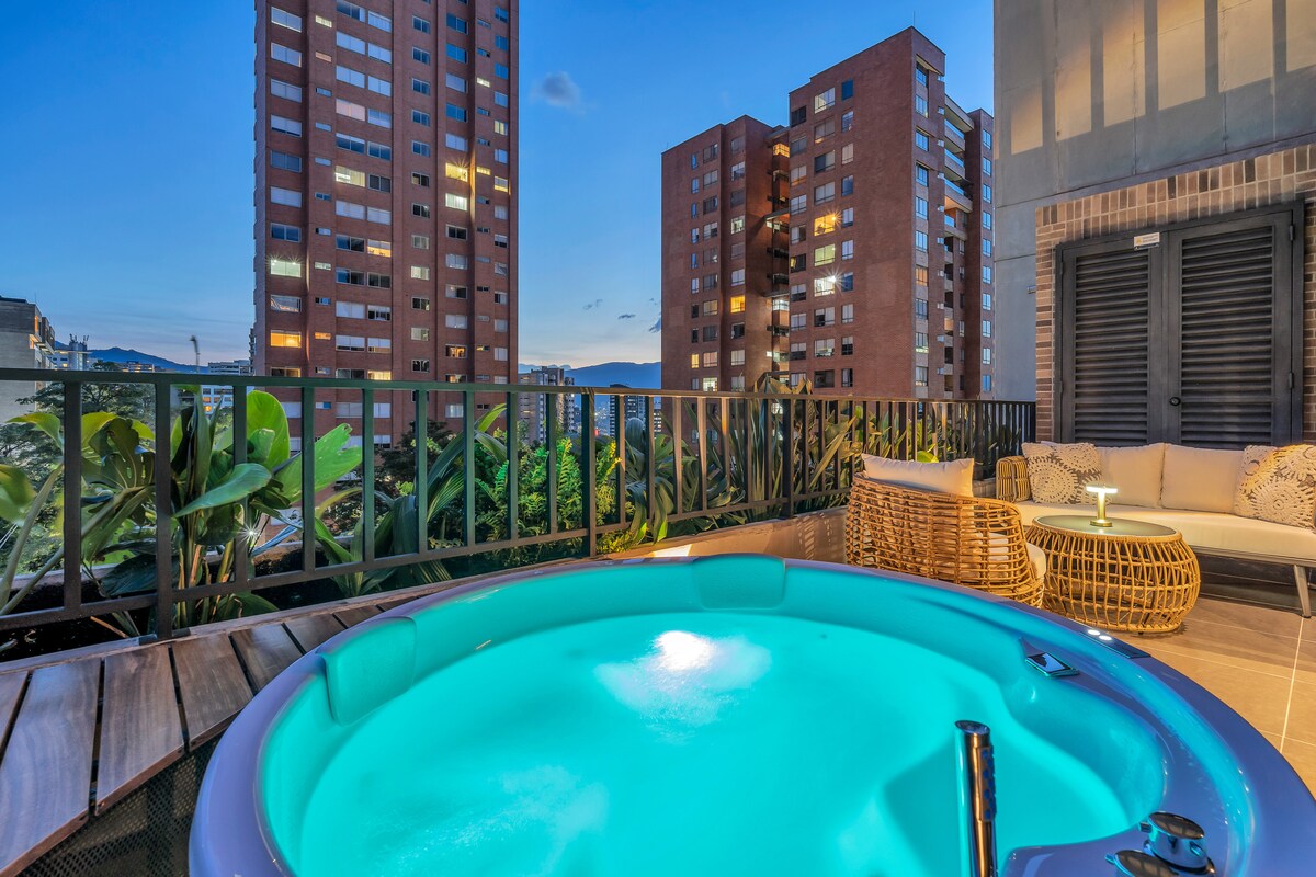 Disfruta Medellín desde este elegante apartamento con terraza privada y jacuzzi, ubicado en Vía Primavera, entre Parque Lleras y Provenza, la zona con más vida nocturna y estilo de la ciudad Su diseño combina materiales naturales, iluminación cálida y confort moderno, creando una atmósfera perfecta para descansar o compartir una copa al atardecer. Cuenta con aire acondicionado, agua caliente y seguridad 24 horas Ideal para vivir una experiencia exclusiva y auténtica en el corazón de Medellín.
