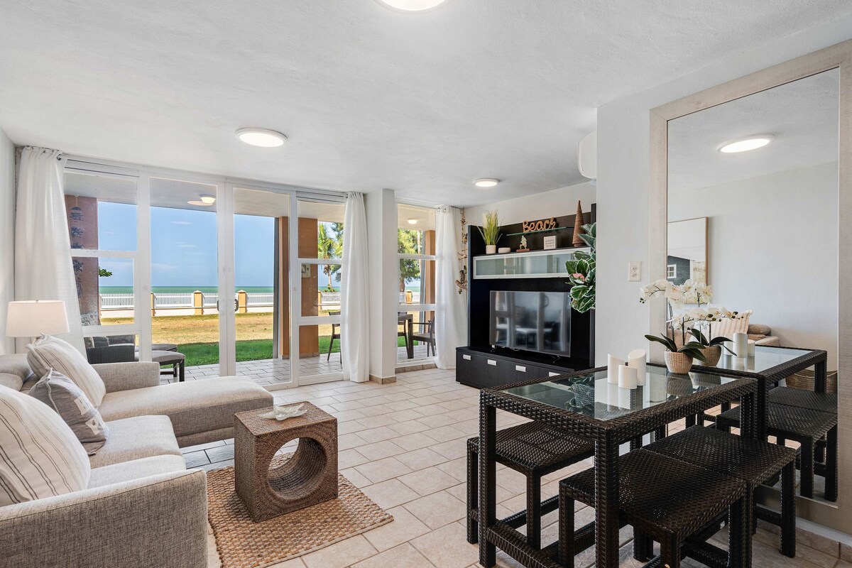 Just 30 minutes from SJU airport, this stunning ground-level beachfront retreat is nestled inside a secluded gated complex. Wake up to the sound of waves and step right onto the sand or take a dip in the refreshing pools just outside your door. Whether you’re soaking up the sun or setting off on an adventure, this prime location offers the best of both worlds. Adventure, awaits 30 mins away: El Yunque Rainforest, natural water slides, Old San Juan, Luquillo Kiosks, Kids Museum, shopping!