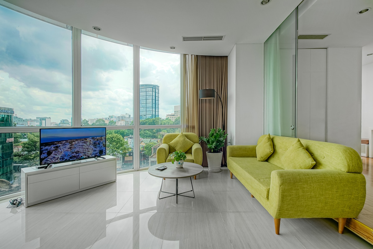 • Ciudad panorámica de 180º desde tu ventana • Mercado Ben Thanh más cercano (500 m), centro de la ciudad (5 minutos a pie), calle Bui Vien (300 m). - Espaciosa con 2 dormitorios y 2 baños. • Dormitorio principal con baño privado. • Ropa de cama y toallas limpias • Piscina en la azotea dentro del edificio. • Gimnasio y piscina gratuitos. Ahorra el precioso tiempo de viaje que tienes en Vietnam alojándote en el corazón de la ciudad de Ho Chi Minh.