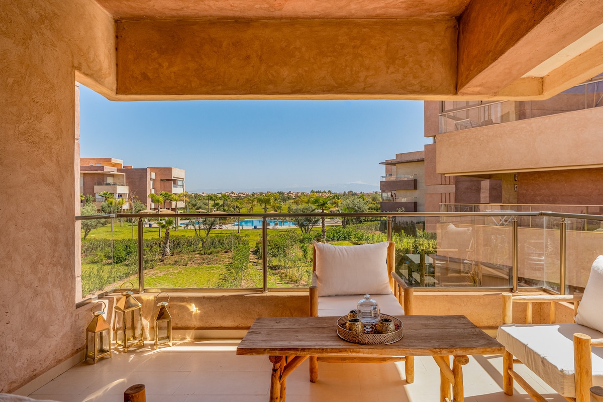 Expérience immersive dans un appartement-galerie contemporaine. Parfaitement situé dans le Triangle d’Or festif, 15 min à pied de la médina. Cet appartement très haut de gamme de 140m2 lumineux et cosy. À deux pas des palaces emblématiques (Mamounia, Sofitel, Casino) Résidence de prestige avec piscine. Idéal jusqu'a 5 voyageurs, il offre 2 chambres, 3 terrasses, 2 salles de bain et 3 WC. Entre ambiance branchée et animée, une expérience unique au cœur de Marrakech vous attend.