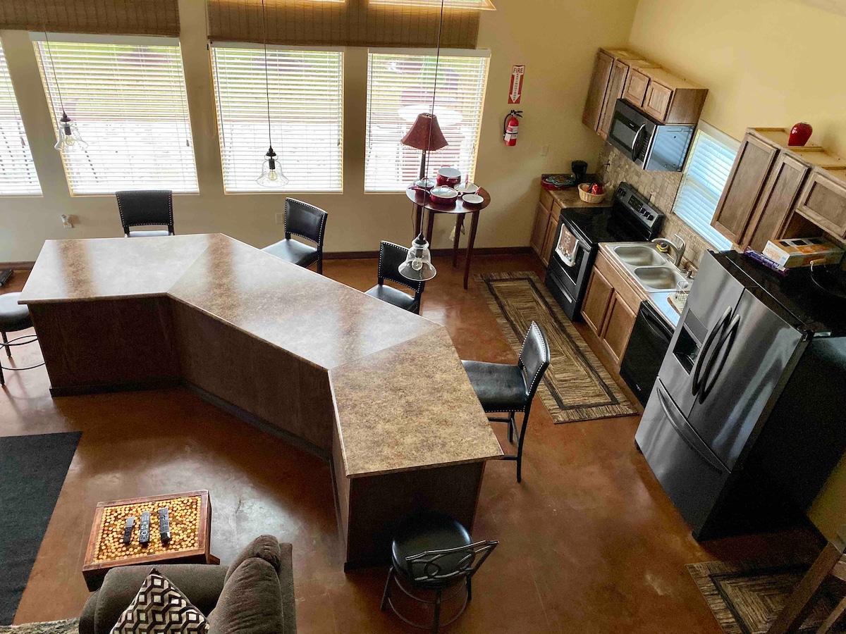 ¡Una vez una cueva para hombres, ahora tu serena escapada! Este acogedor refugio cuenta con una extensa isla, amplios asientos y un televisor inteligente de pantalla plana de 75 pulgadas con sonido envolvente, perfecto para entretener a los huéspedes con juegos o noches de cine. Con su diseño de concepto abierto y sus altos techos abovedados, la sala de estar irradia un ambiente de cabaña espaciosa. Ubicado en una tranquila comunidad rural, este refugio único está bañado por abundante luz natural a través de sus amplias ventanas frontales, elevando el ambiente tranquilo general.
