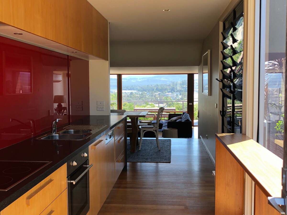 Tranquilo refugio costero en una de las mejores calles de Merimbula. A pie de la playa y la ciudad. O relájate en casa disfrutando de las vistas al agua a través de los árboles y escucha a las aves nativas: pájaros campanilla y pájaros látigo. Recién reformado, privado, de planta abierta con un moderno ambiente costero. A poca distancia a pie o en coche de Spencer Park Beach (750 m), Rotary Park (700 m), Short Point Beach, la ciudad y el nuevo sendero compartido de Lake Street (750 m) que te lleva a Bar Beach. Wifi ilimitado, Netflix y Binge.