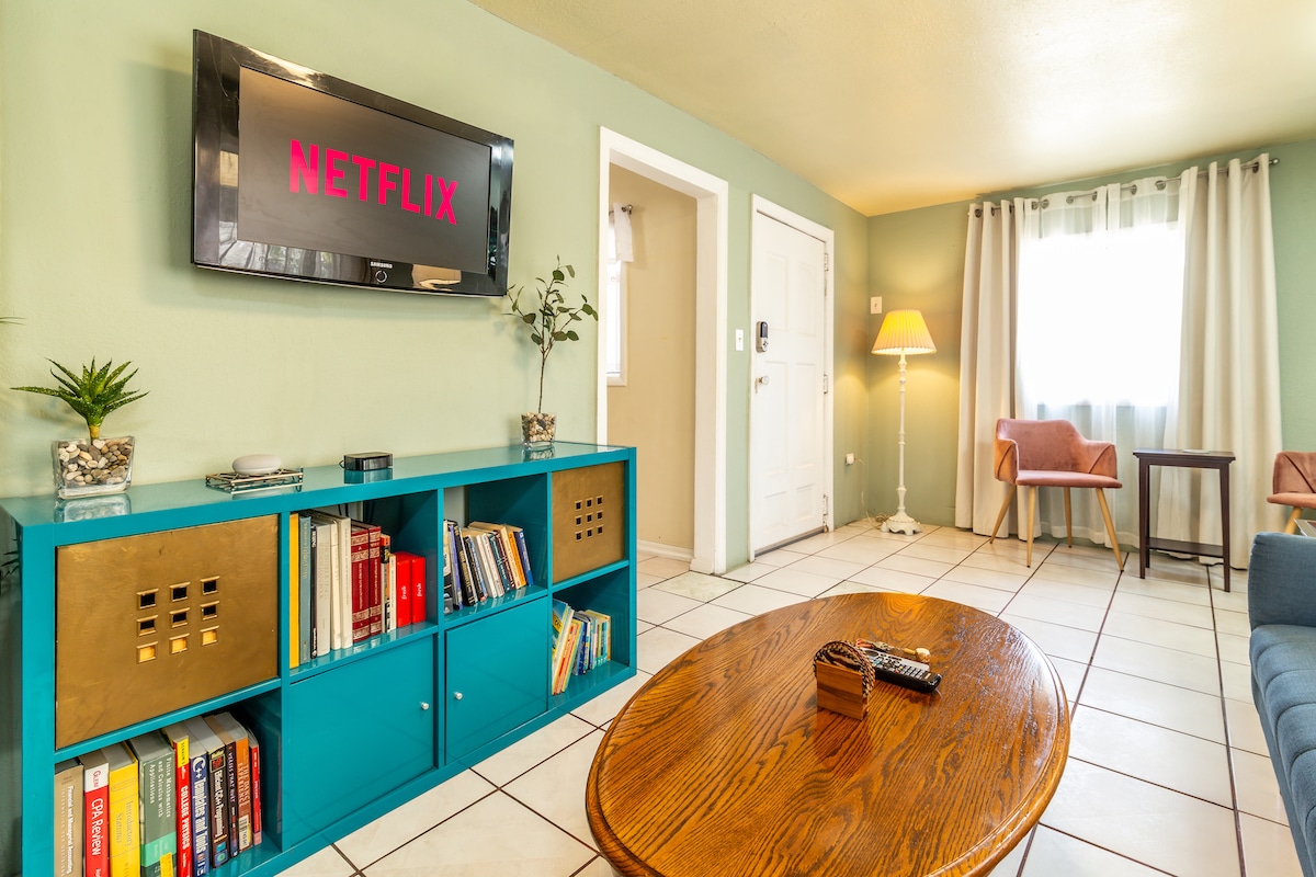 A 2 minutos de Palacio Municipal, 3 min. Garita Internacional, 10 min. aeropuerto (en automóvil). Espacio privado, seguro e independiente. Departamento completo de 1 recamara con cocina y baño privado. Incluye roku TV, internet, comedor y cocina equipada con estufa, refrigerador, cafetera y microondas. Este departamento comparte reja de entrada, en la propiedad hay más departamentos, cuenta con un área exterior compartida con mesas y sillas de patio así como un asador para su uso.