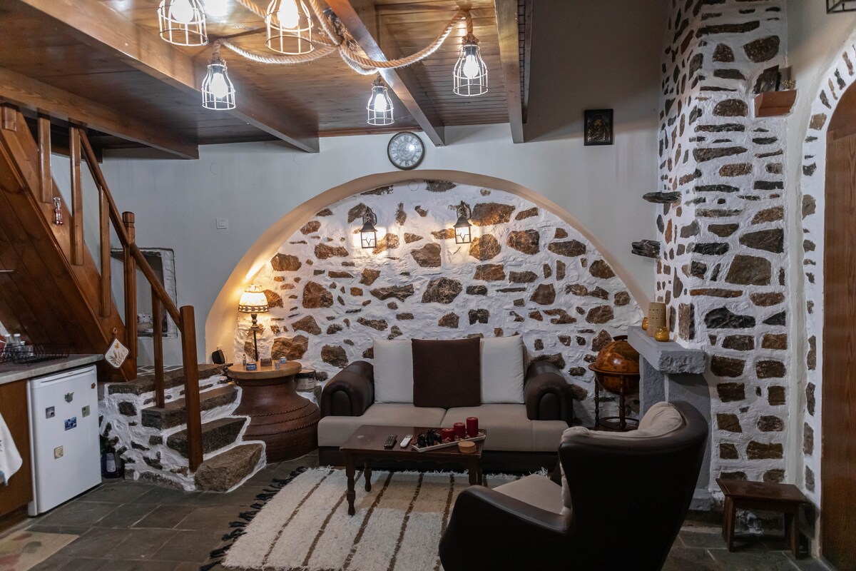 Byzantine Home Rebuild in 2022 Under Archaeology Supervision with original construction products and absolutely no changes to the structure of the home that is a part of a castle built approximately 950+ years ago. Main Bedroom with a Queen bed and a Full size bed on a Elevated Wooden Structure that was Rebuilt to Original Stage and can fit 2 additional Adults/Kids.The other Bedroom is also the TV Room with a Queen size Mattress for 2 Additional Guest. The house is very Unique and Original