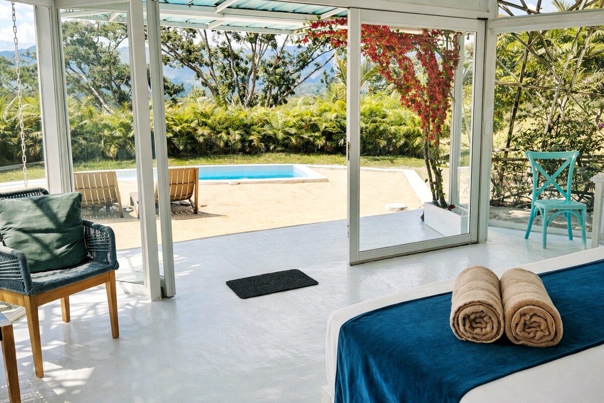 Hermosa habitación tipo glamping en medio de las montañas, naturaleza pura. Contamos con una espaciosa Terraza mirador donde se aprecia la bella ciudad de Acacias, el río Guayuriba, Villavicencio, se aprecian todas las estaciones de petróleo, también Guamal y su gran río, y a lo lejos San Martín y Granada, y gran parte de nuestra cordillera oriental. Parqueadero gratuito. Nuestra habitación principal tipo glamping es totalmente privada. Servicio de cena y decoración con costo adicional.