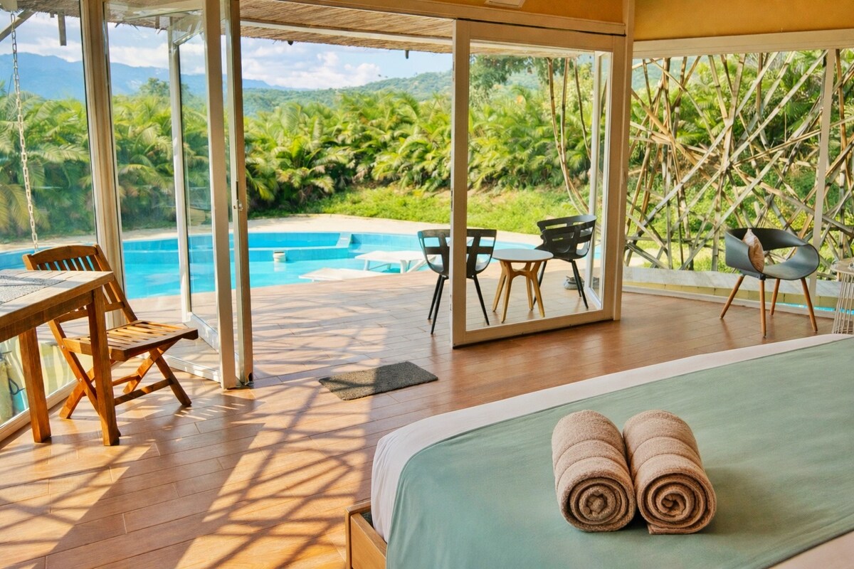 Ven a disfrutar de la mezcla perfecta entre Naturaleza y Comodidad. Nuestro exclusivo resort Glamping Eco de 4 estrellas se encuentra a solo 45 minutos del Aeropuerto Internacional "El Dorado" de Bogotá. Ven a relajarte y rebobinar con vistas mágicas. Nuestro restaurante ofrece los más deliciosos platos internacionales y colombianos junto con una variedad de refrescantes y famosos cócteles tropicales, licores y bebidas. Tiempo perfecto todo el año (72°F - 22°C).