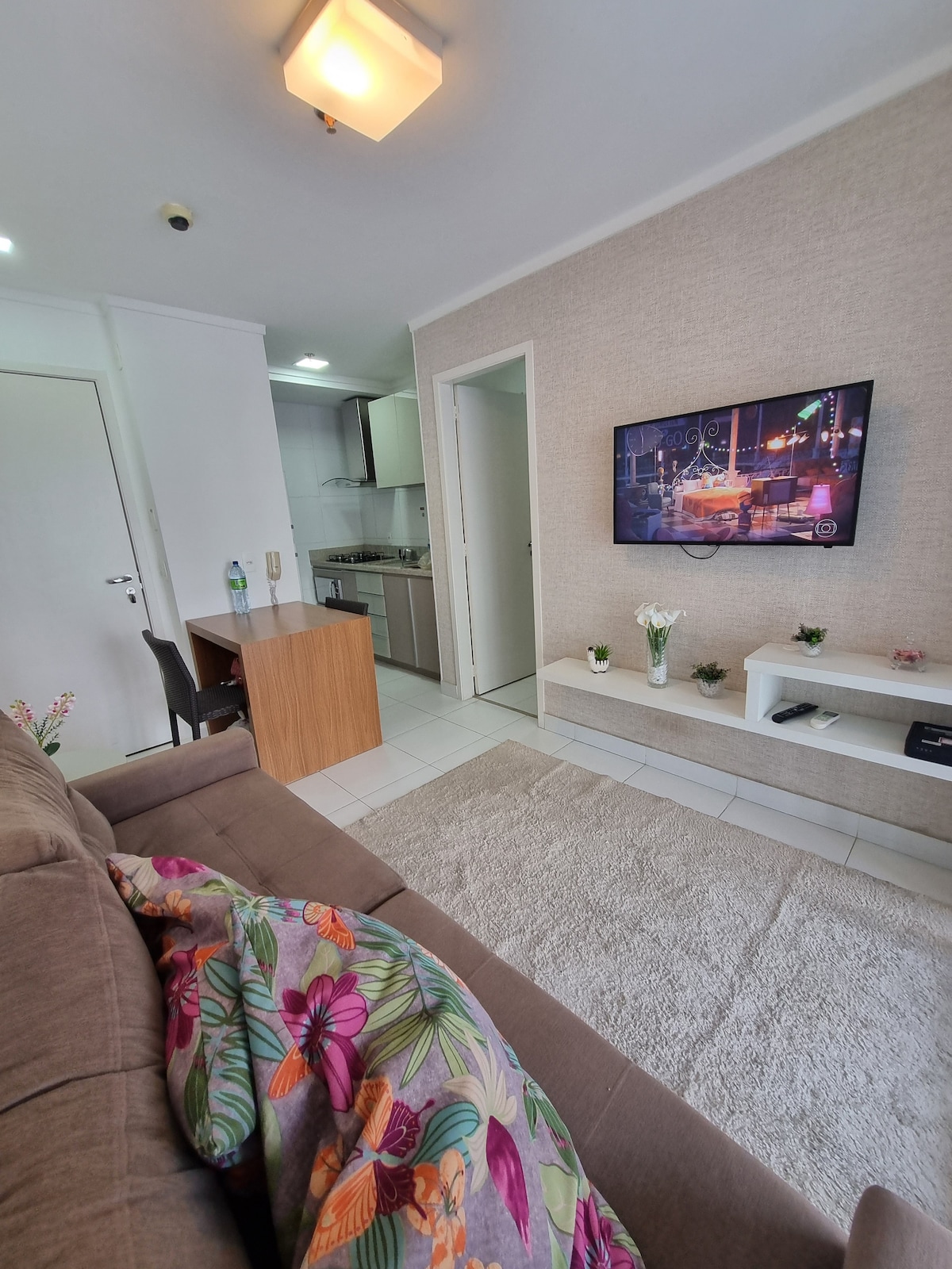 Apartamento de 45 m2. Dormitorio: cama tamaño queen,armarios, encimera de oficina, TV 4K 50”,aire acondicionado, ropa de cama/baño. Sala de estar: sofá cama, TV 4K 50”,aire acondicionado,mesa y 4 sillas de diseño italiano. Cocina:armarios,encimera, encimera de 4 quemadores,nevera, horno eléctrico, horno microondas, cafetera eléctrica, filtro de agua, sandwichera, ollas y sartenes,utensilios. Piscina infinita, hidromasaje, sauna,gimnasio, biblioteca de juguetes, fiesta en el salón, espacios gourmet. 1 lugar de estacionamiento. Portero las 24 horas y seguridad. Tenemos otro departamento.